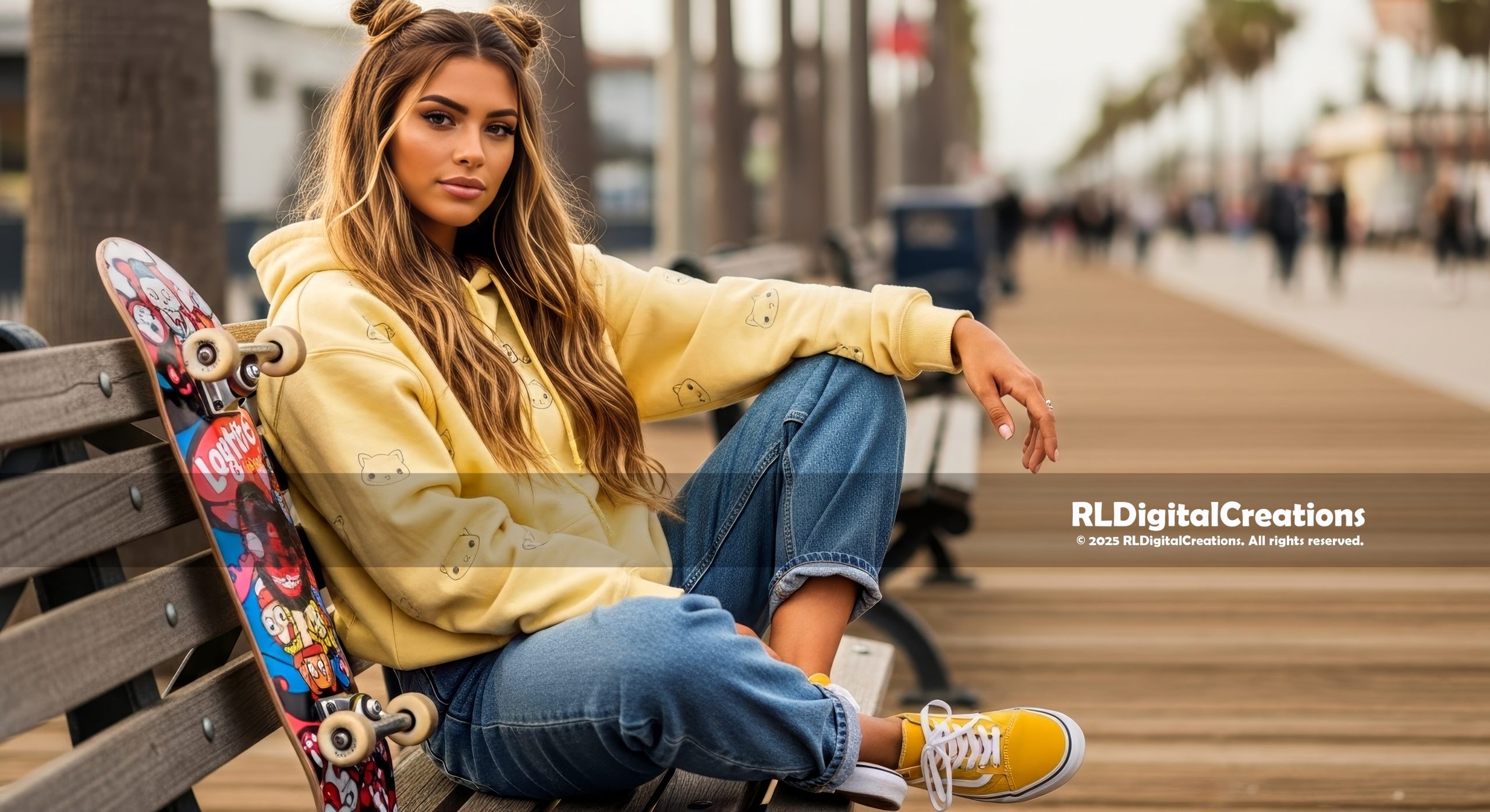 A confident skater girl relaxes on a boardwalk bench in a pastel-yellow cat hoodie, ripped jeans, and bright sneakers, her graphic skateboard propped beside her as the blurred pier stretches into the distance. This ultra–high-resolution digital artwork blends street style, coastal energy, and playful cat details, making it a bold statement piece for modern walls or screens—and is available as an instant download for $10.