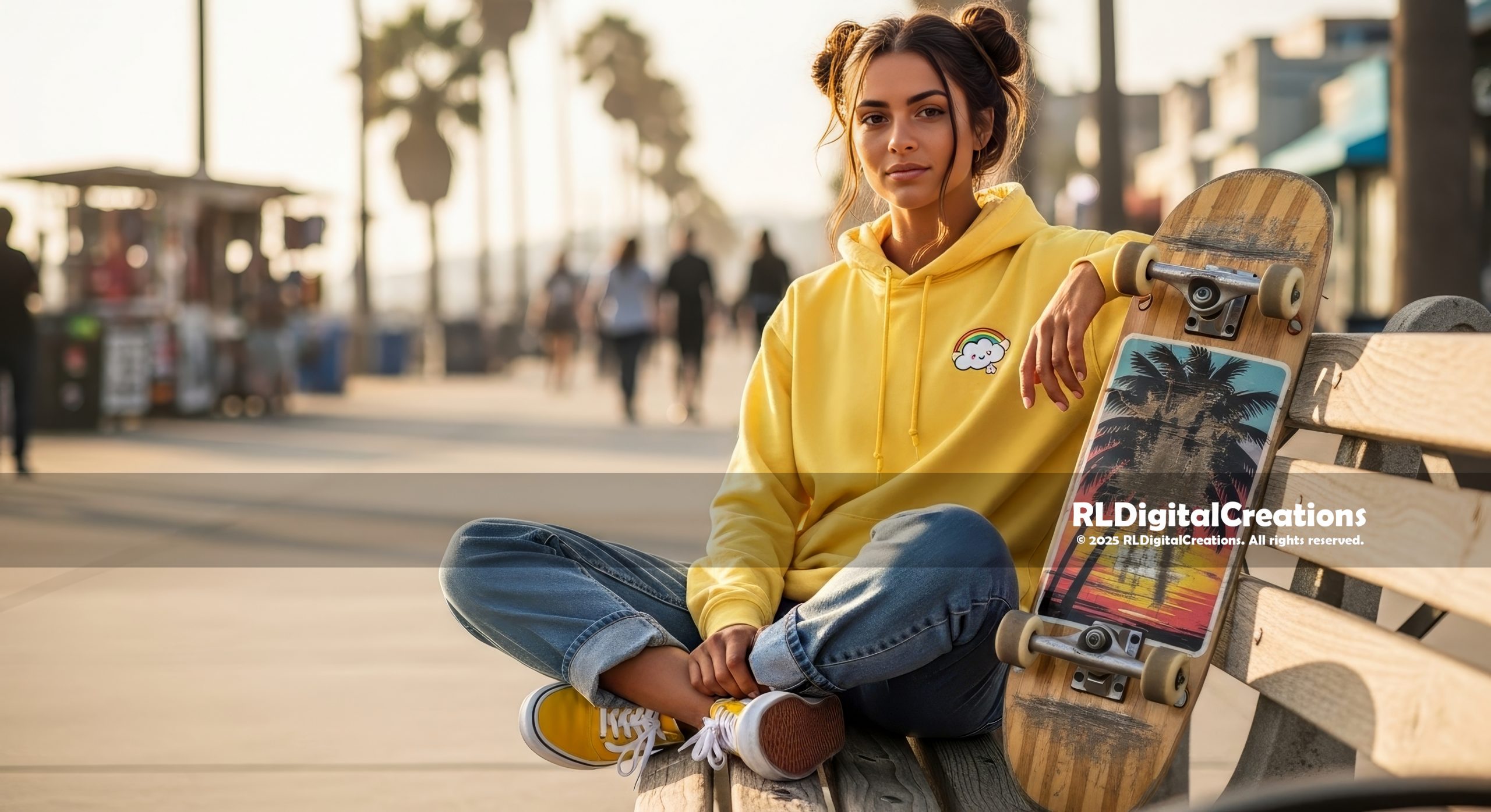 A chill skater girl sits on a boardwalk bench in a bright yellow hoodie and rolled denim, her sunset-palm skateboard resting beside her as the evening crowd blurs into warm golden light behind her. This ultra–high-resolution digital artwork is perfect for adding laid-back coastal skate vibes to your space—stunning on screens or as a high-quality wall print—and is available as an instant download for $10.