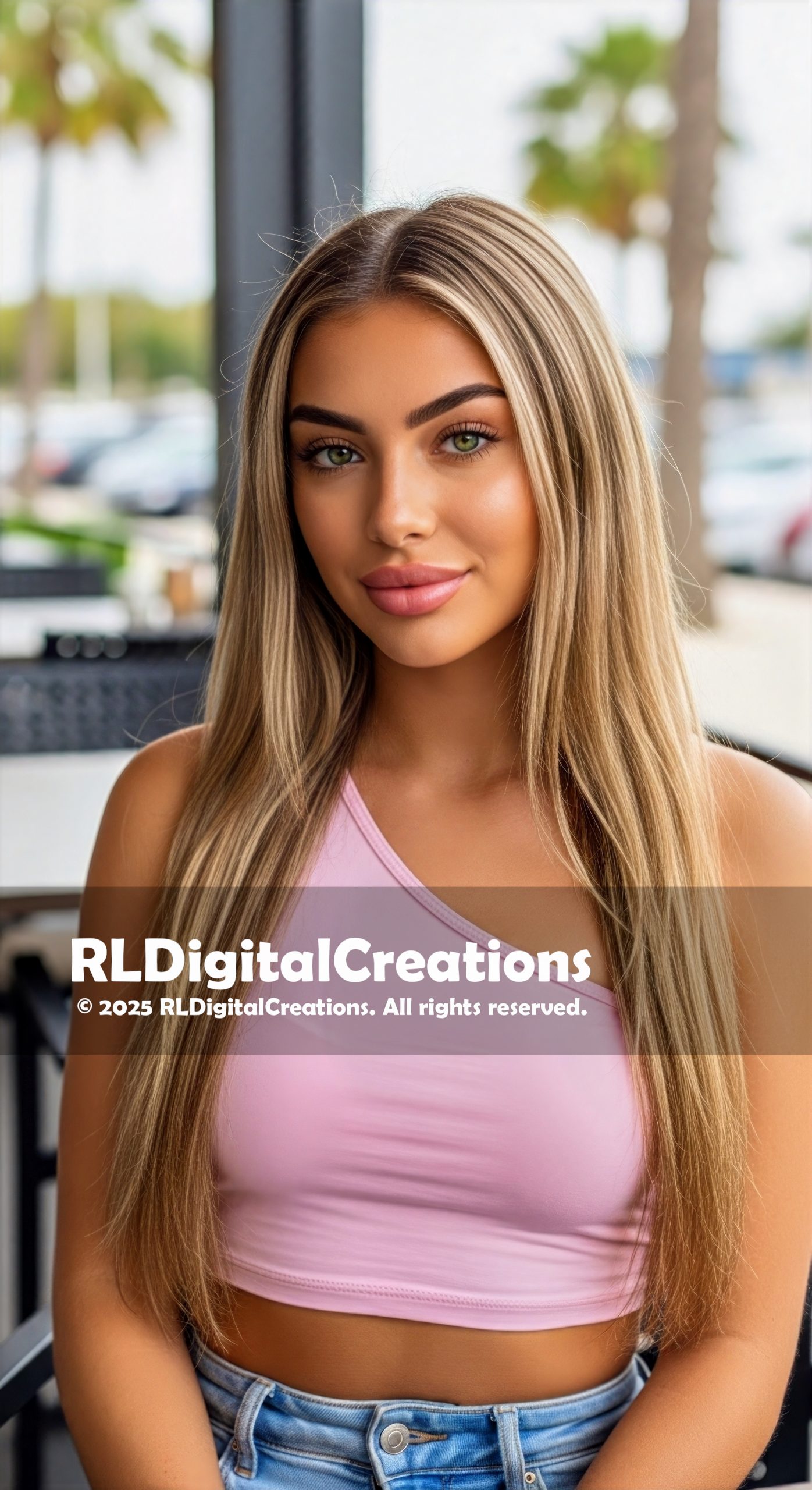 This fresh portrait captures effortless confidence in a bright café setting with a relaxed, modern vibe. Her striking green eyes and soft, polished makeup create a magnetic focal point that feels warm and inviting. Long, sleek hair frames her face with a smooth, glossy finish that elevates the entire composition. The soft pink top adds a sweet, feminine touch while keeping the look clean and contemporary. Blurred palm trees and airy daylight in the background give the scene a sunny, coastal feel without distracting from her expression. Perfect for collectors who love trendy lifestyle imagery and soft-glam aesthetics, this piece adds calm beauty and confidence to any digital collection. This piece is available for $5.