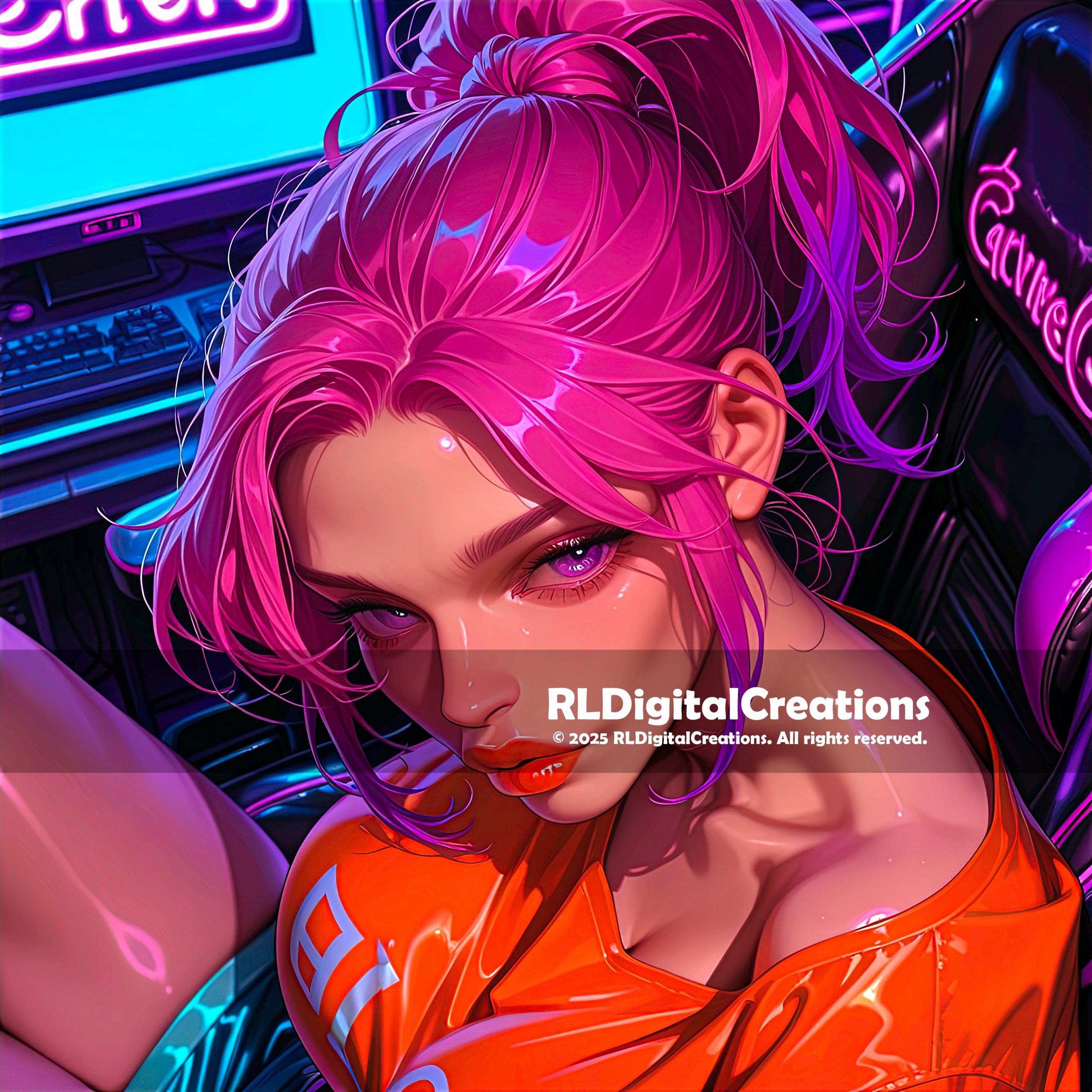 This artwork is a neon-drenched close-up that feels like midnight electricity on your skin. Her hot-pink hair and violet gaze pull you in fast, like a secret you weren’t supposed to hear. The glossy orange jacket throws back the light in slick highlights, giving the whole scene that high-fashion cyber edge. Cool blues and deep purples in the background create a moody, futuristic glow that makes every detail pop. It’s bold, flirty, and confident—perfect for anyone who loves synthwave vibes, gaming aesthetics, and statement visuals. Use it as a wallpaper, a poster print, or a standout piece in a digital collection that lives loud. This piece is available for $5.