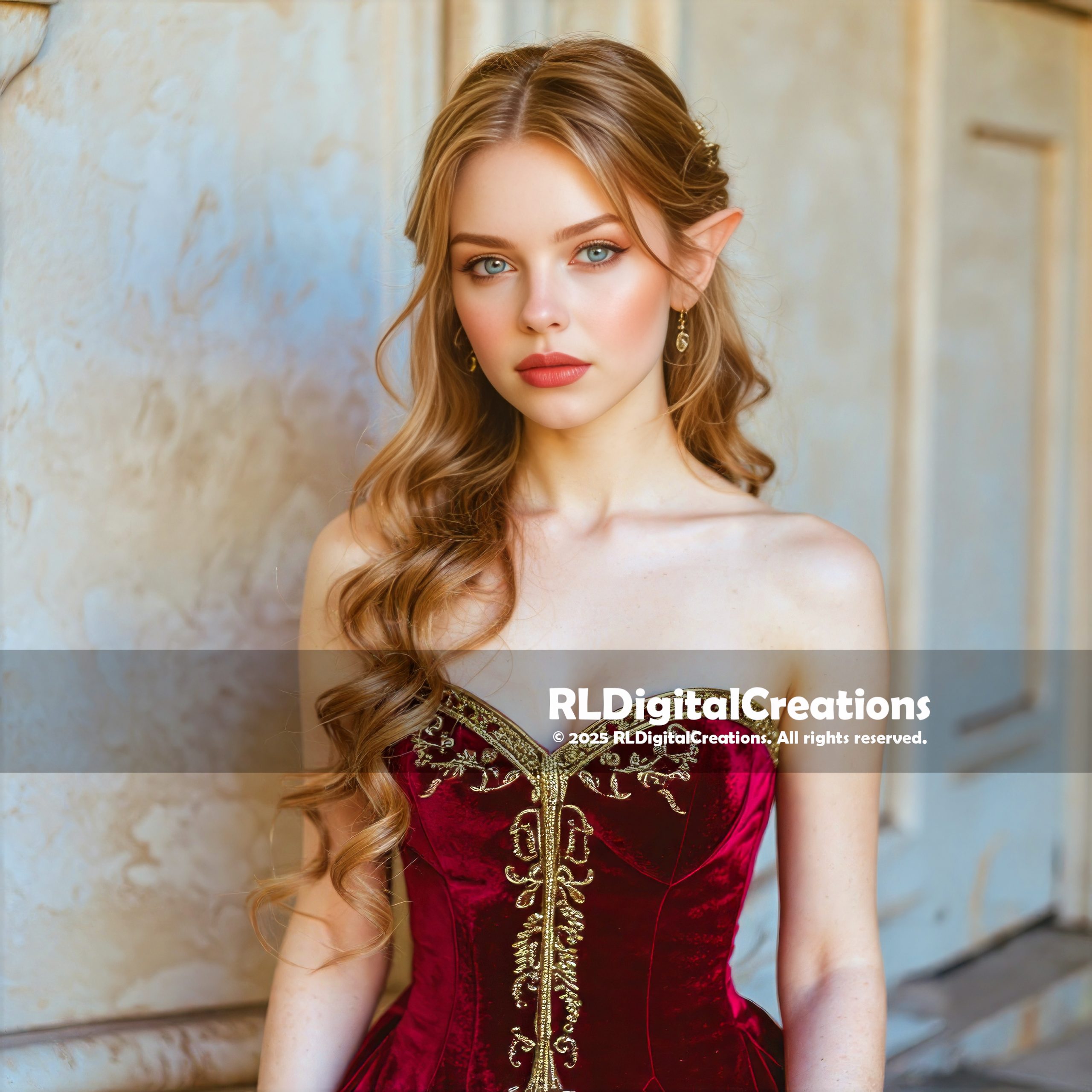 This enchanting portrait introduces a soft yet striking elf muse bathed in warm, natural light. Her sea-glass eyes and velvety red lips create a captivating contrast that feels both delicate and powerful. Cascading waves of chestnut hair frame her face with effortless romance, while her pointed ears hint at hidden magic. The crimson velvet bodice, embroidered in ornate gold, brings a regal richness that instantly elevates the entire composition. Subtle stone textures and a quiet doorway behind her add depth without stealing focus from her presence. Perfect for fantasy collectors and elegant décor lovers, this piece delivers timeless beauty with a touch of mythic allure. This piece is available for $25.