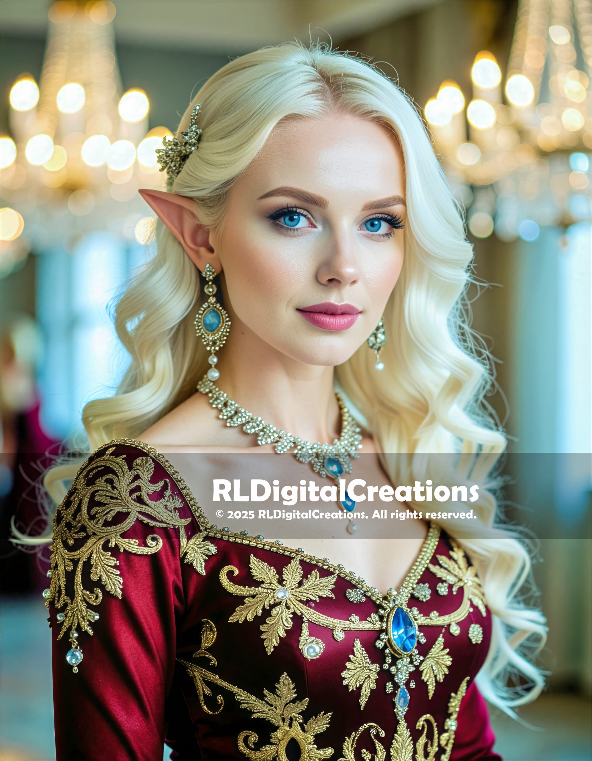 This portrait captures an elven queen in full splendor, wrapped in candlelit glamour and quiet authority. Her luminous blue eyes and flowing platinum curls create an instantly iconic fantasy centerpiece. The jeweled adornments—sapphire drops, intricate filigree, and radiant pearls—feel like heirlooms passed down through an immortal royal line. Her deep crimson gown, embroidered with ornate gold flourishes, adds a rich, ceremonial elegance that commands attention. The soft bokeh lights behind her heighten the atmosphere, giving the scene a grand ballroom glow without stealing focus from her gaze. This piece is perfect for collectors who love regal fantasy, elven nobility, and luxurious character-driven artwork. This piece is available for $30.
