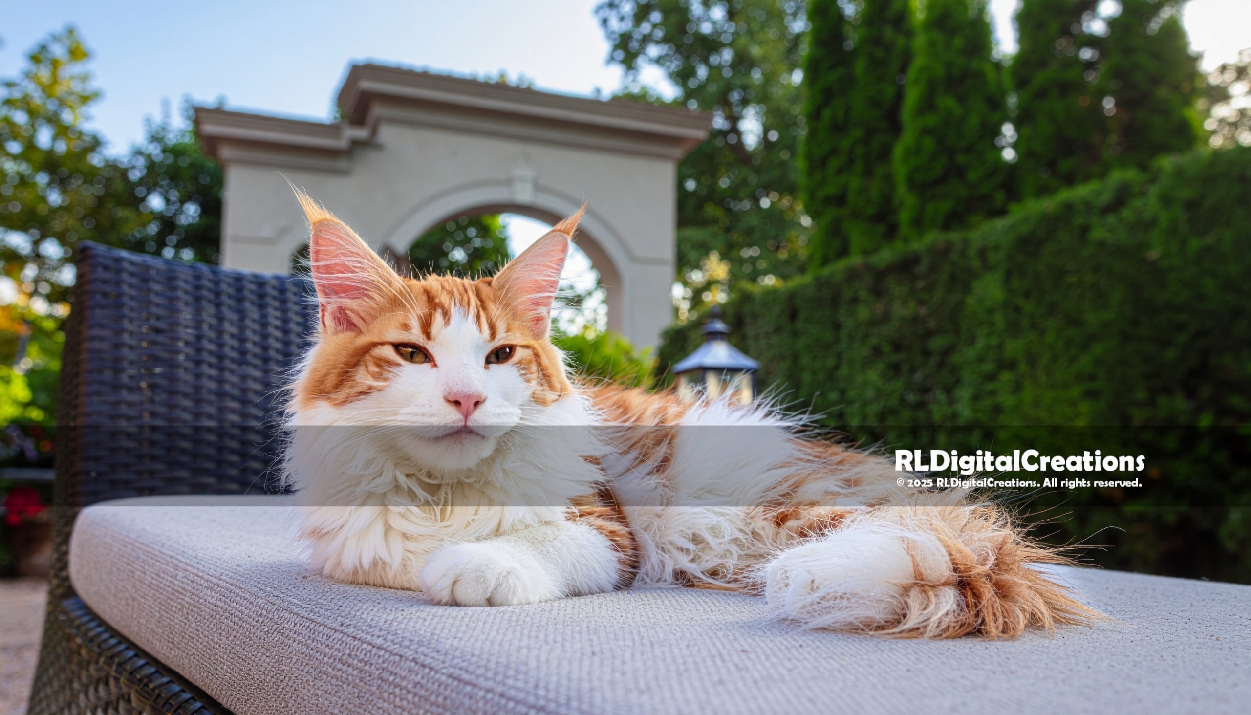 This striking digital artwork captures a long-hair white and orange tabby reclining like nobility on a plush outdoor lounger, framed by manicured hedges and a stately stone archway in the morning light. Crisp fur detail, soft greenery, and elegant architecture blend into a scene that feels both luxurious and serene, perfect for adding a touch of refined calm to any room or screen. This high-resolution piece is available as an instant digital download for $10, ready to print for wall décor or enjoy as a stunning wallpaper.