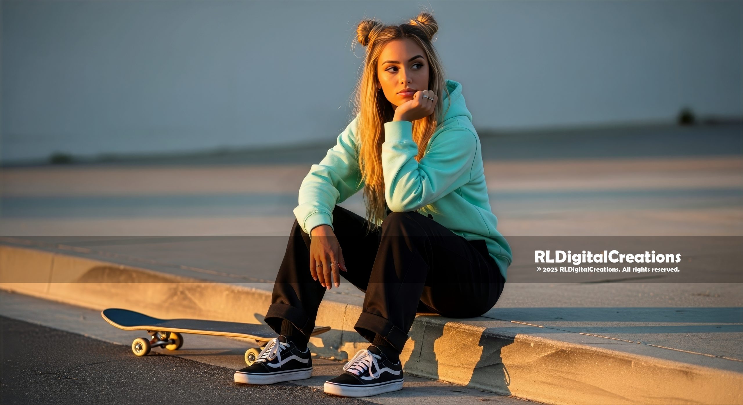 A pensive skater girl sits on the curb in warm sunset light, mint hoodie glowing against the smooth concrete as her board rests at her feet, capturing that quiet in-between moment after the tricks and before the night begins. This ultra–high-resolution digital artwork brings modern street style and soft golden ambiance to any space—perfect as a statement wall print or screen background—and is available as an instant download for $10.