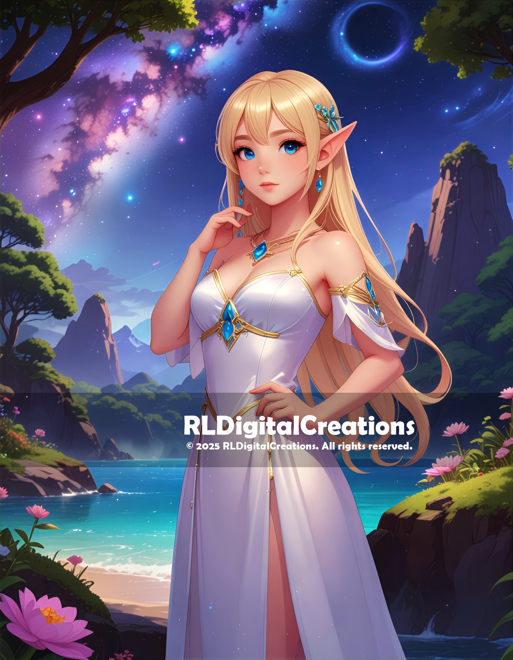 Bathed in starlight beneath a crescent sky, this serene elven princess stands at the edge of a glowing turquoise sea, her sapphire jewels reflecting the cosmos above. Soft petals, distant cliffs, and a shimmering shoreline frame her graceful white gown, creating a tranquil balance of celestial wonder and coastal magic. Her luminous blue eyes and delicate golden hair invite you into a peaceful fantasy realm where the night itself seems to breathe. This high-resolution digital download is available for $15, offering an elegant touch of elven enchantment for your screens or fantasy-themed décor.