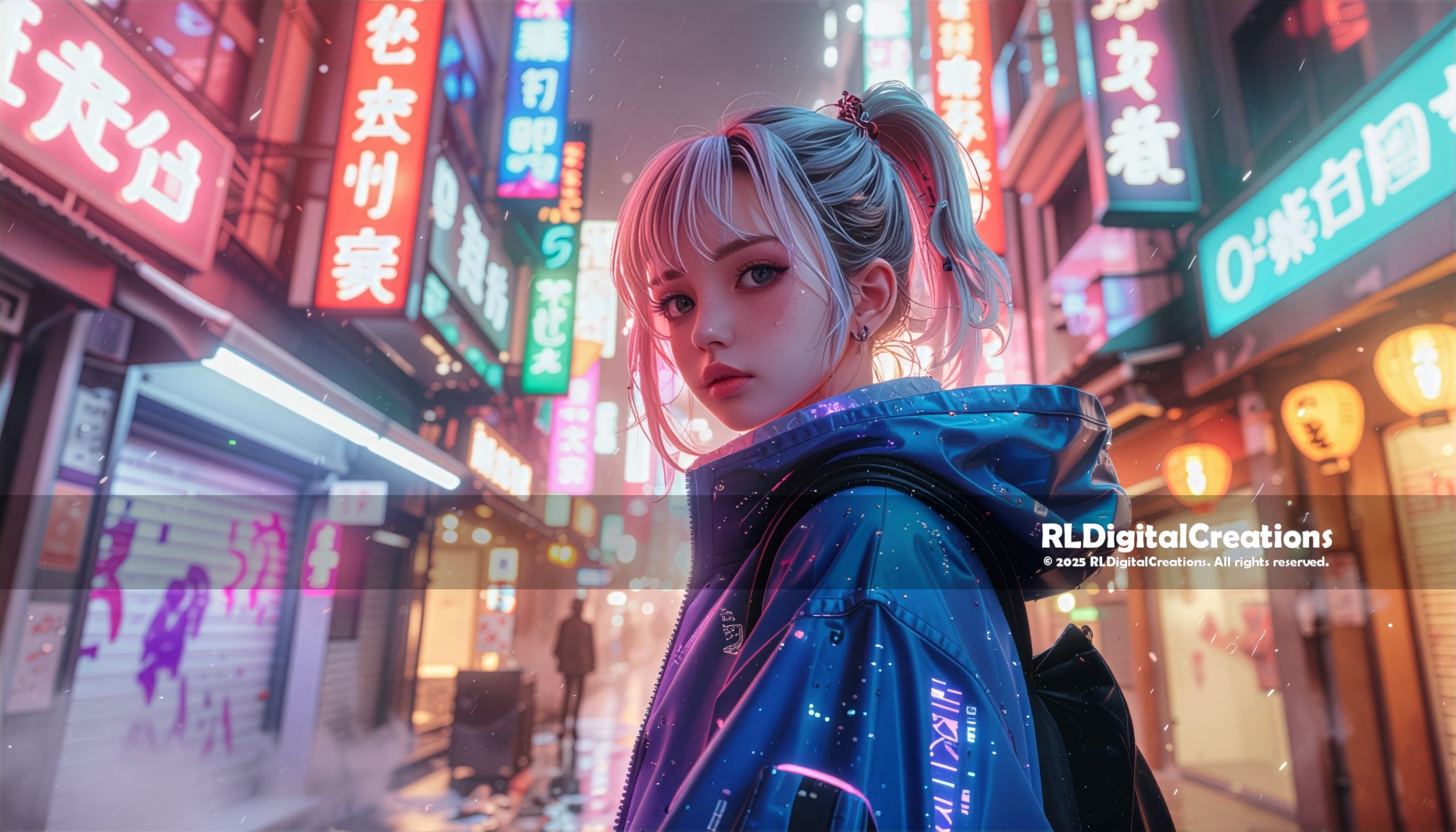 This striking digital artwork captures a cyberpunk street draped in rain and neon, as a lone techno-chic girl glances back over her shoulder, her pale hair glowing with the reflected colors of the city lights. Her futuristic jacket shimmers with digital patterns, while the blurred crowd and glowing signs behind her create a sense of motion, mystery, and late-night freedom. This high-resolution digital download is available for $20, perfect for adding bold futuristic energy to your screens or print collection.