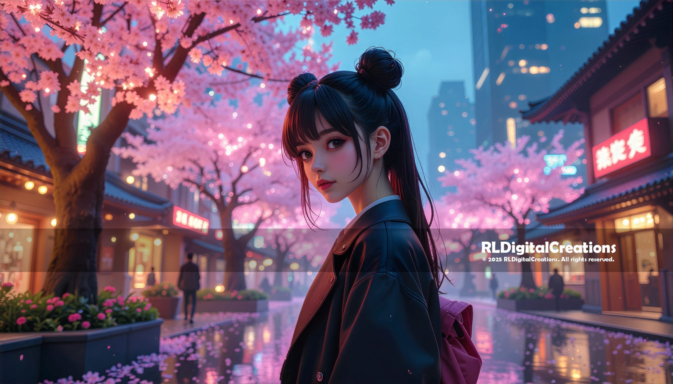 Bathed in the glow of lanterns and neon signs, a midnight-haired heroine pauses beneath blooming cherry trees, her gaze calm, confident, and just a little untouchable. Fallen petals shimmer across the rain-kissed street, mirroring the electric pinks and blues that trace the edges of her leather jacket and frame her silhouette against the city skyline. The mix of soft blossom light and urban glow turns this quiet alley into a dreamscape where romance, mystery, and future-city energy collide. This high-resolution digital download is available for $25, perfect for bringing a touch of ethereal anime magic to your desktop, studio, or living space.