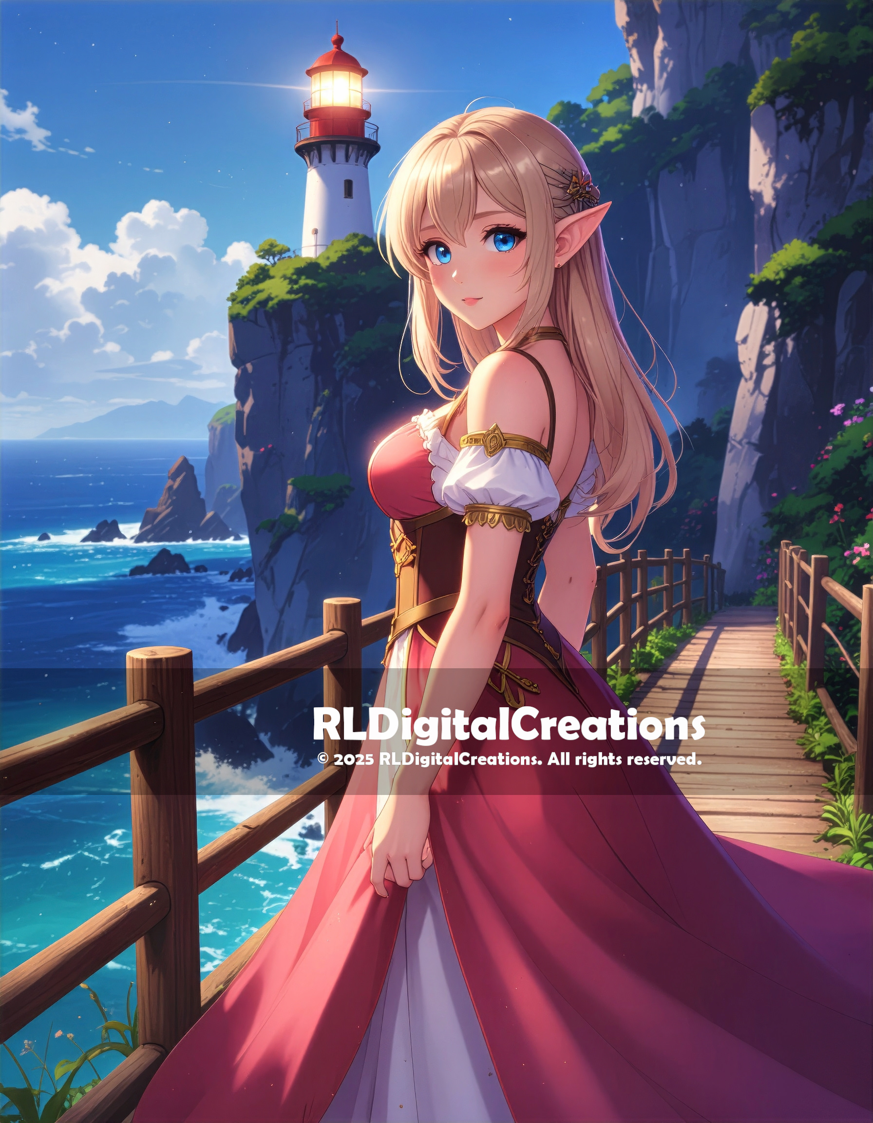 An elegant elven maiden pauses on a wooden cliffside path as the lighthouse behind her burns like a guardian star above the crashing sapphire waves. Warm sunset light glows across her rose-and-gold gown and bright blue eyes, blending coastal serenity with quiet, otherworldly magic. This high-resolution digital download is available for $15, perfect for bringing a touch of fantasy and seaside calm to your screen or décor.