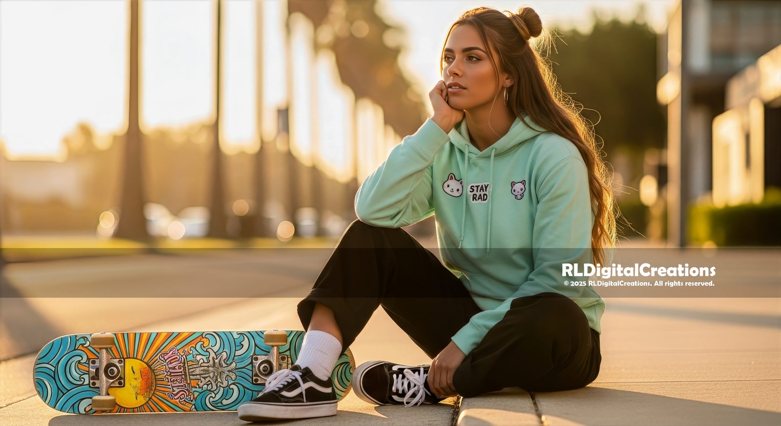 A laid-back skater girl sits in the glow of golden hour, mint “STAY RAD” hoodie and cat patches popping against the smooth pavement while her colorful board rests at her feet, capturing pure chill street energy with a soft, dreamy warmth. This ultra–high-resolution digital artwork is perfect for adding modern, coastal-skater vibes to your walls or screens, and is available as an instant download for $10.
