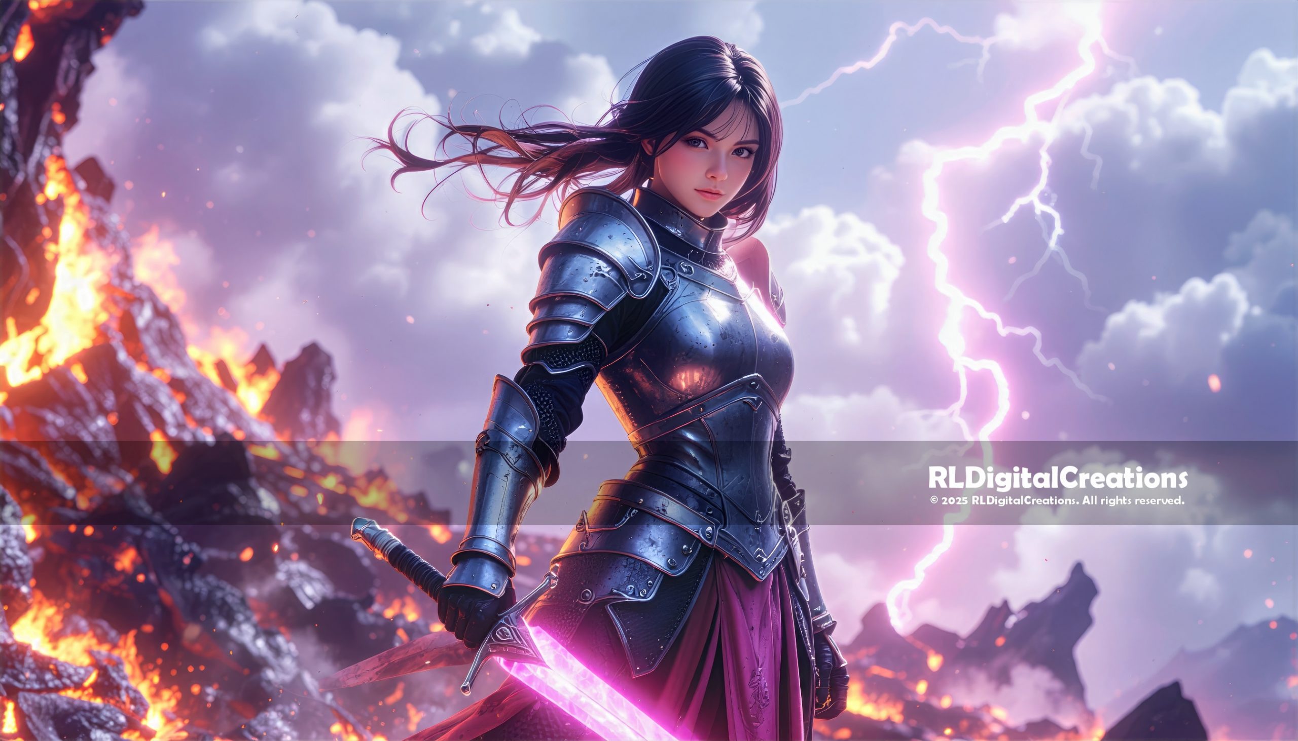 Lightning rips across a burning sky as this armored valkyrie stands unshaken on a field of molten rock, her celestial blade glowing with searing pink light that cuts through the chaos. Every reflection on her polished armor, every ember in the volcanic landscape, and every strand of wind-tossed hair captures a moment of power, resilience, and fearless beauty. This high-resolution digital download is available for $15, offering a striking statement piece for fans of epic fantasy warriors and dramatic, game-ready artwork.