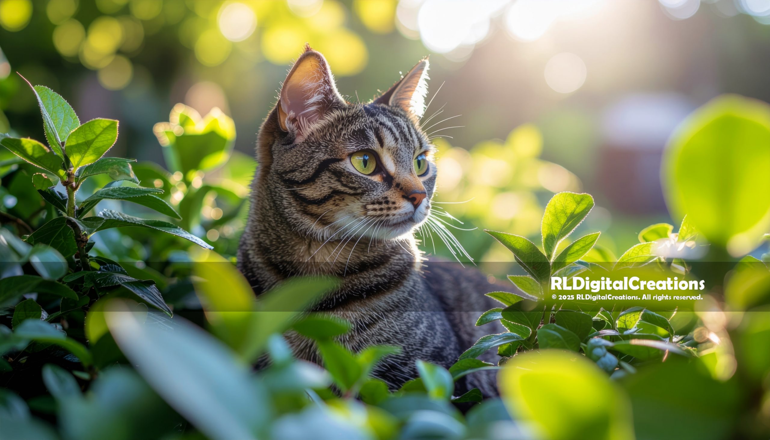A sleek tabby cat rests among lush green leaves, eyes glowing in the warm evening light as soft bokeh turns the garden into a calm, golden sanctuary. This ultra–high-resolution digital artwork is perfect for cat lovers who want nature, warmth, and quiet elegance on their screen or as a high-quality wall print, and is available as an instant download for $10.