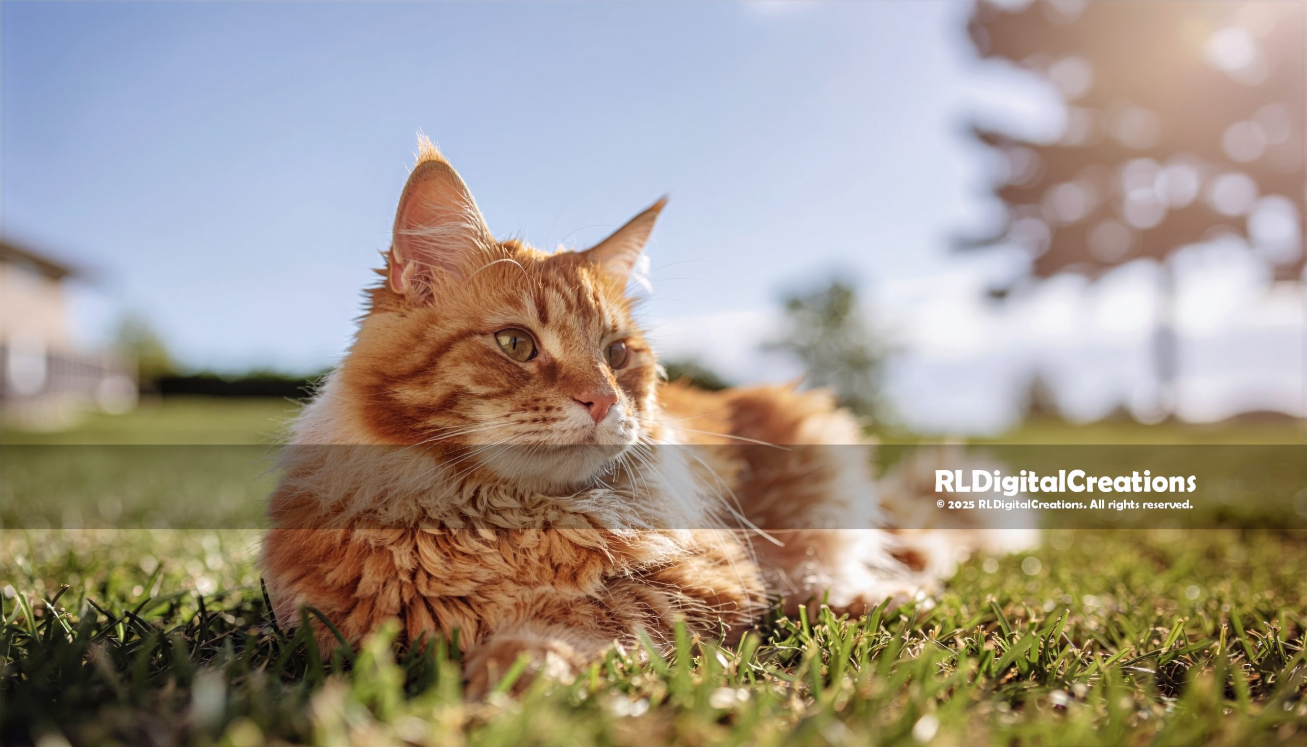 A regal ginger longhair cat lounges in the sun-warmed grass, framed by a bright blue sky and soft bokeh background that make the whole scene feel like a perfect summer afternoon. The rich fur detail, low angle perspective, and glowing light create a cozy, peaceful vibe that’s ideal for cat lovers who want warmth and personality on their screen or wall. This ultra–high-resolution digital artwork is available as an instant download for $10.