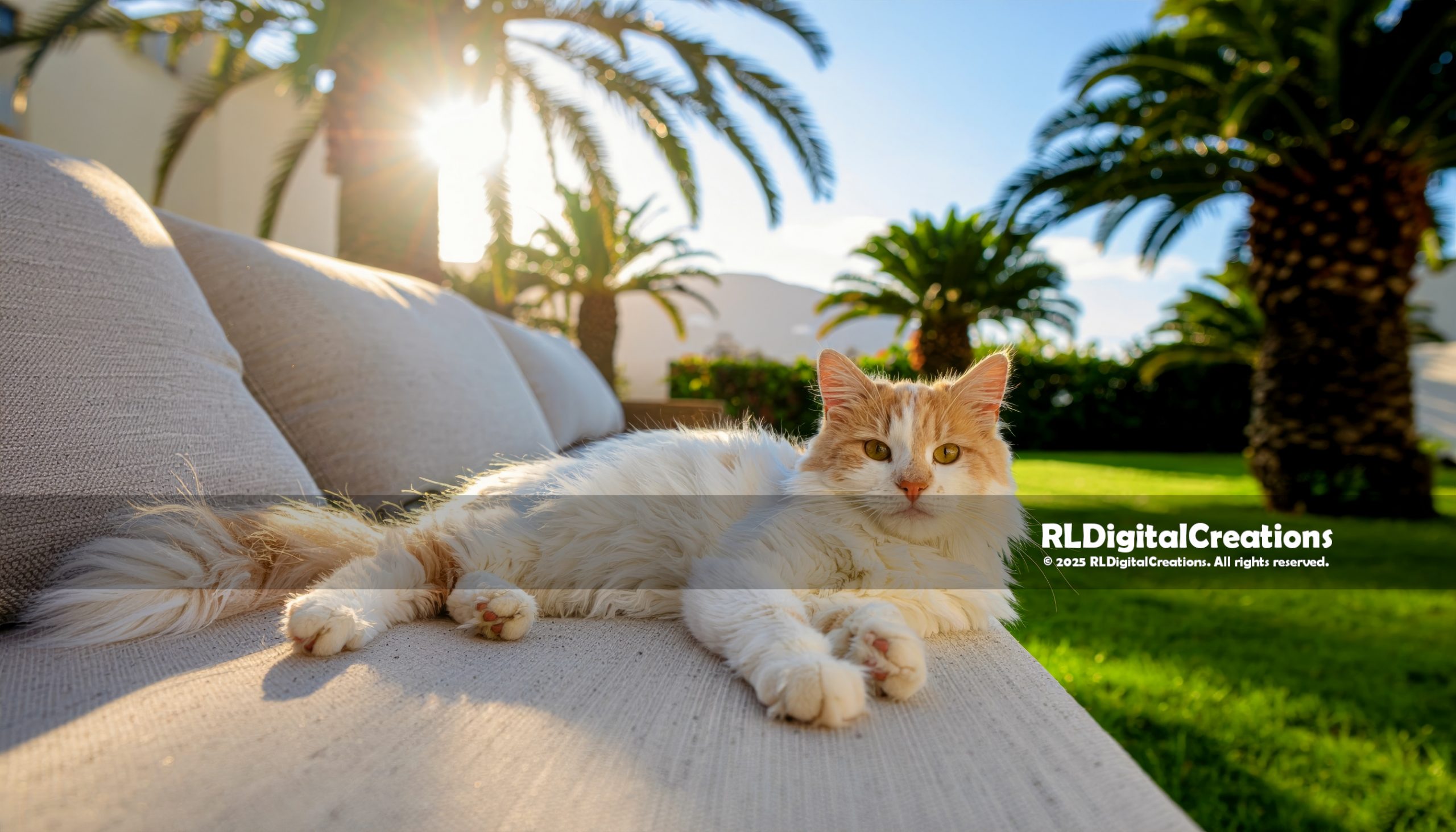 A fluffy white-and-ginger kitten stretches out on a modern outdoor sofa as golden sunlight pours through the palm trees, creating a dreamy, relaxed resort vibe. This ultra–high-resolution digital artwork is perfect for adding sunny, luxurious charm to any cat lover’s space—stunning on screens or as a high-quality wall print—and is available as an instant download for $10.