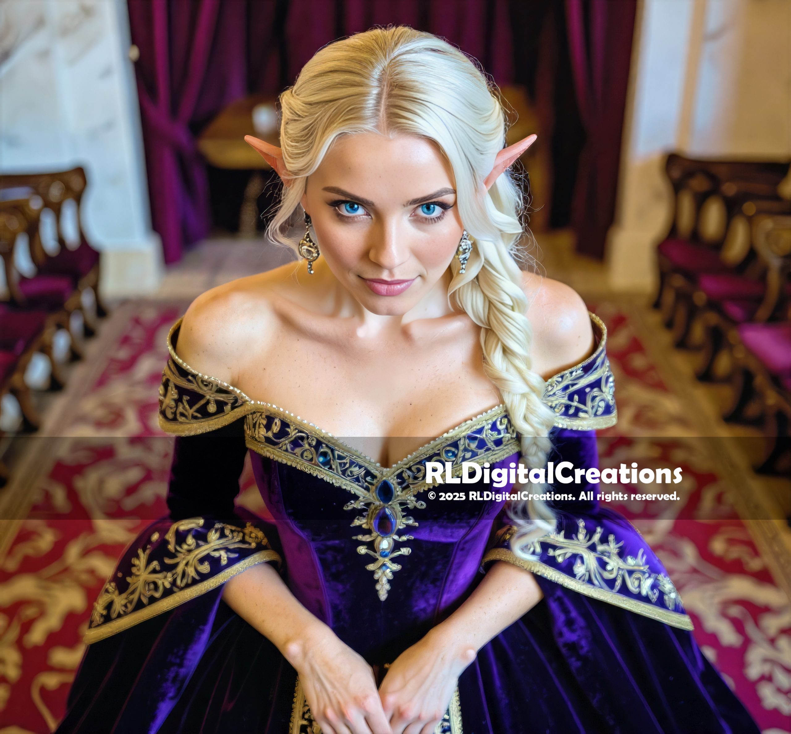 This striking portrait captures an intimate moment in a grand hall, where royalty feels close enough to touch. Her icy-blue eyes and subtle, knowing expression create a powerful connection that holds your attention instantly. The elegant braid, pointed ears, and shimmering earrings blend classic fantasy charm with polished realism. Wrapped in a deep violet velvet gown with intricate gold detailing, she embodies luxury, poise, and quiet authority. The soft candlelit atmosphere and rich crimson drapery behind her add warmth and cinematic depth to the scene. Perfect for collectors who love regal fantasy and character-driven artwork, this piece brings presence and mood to any display. This piece is available for $25.