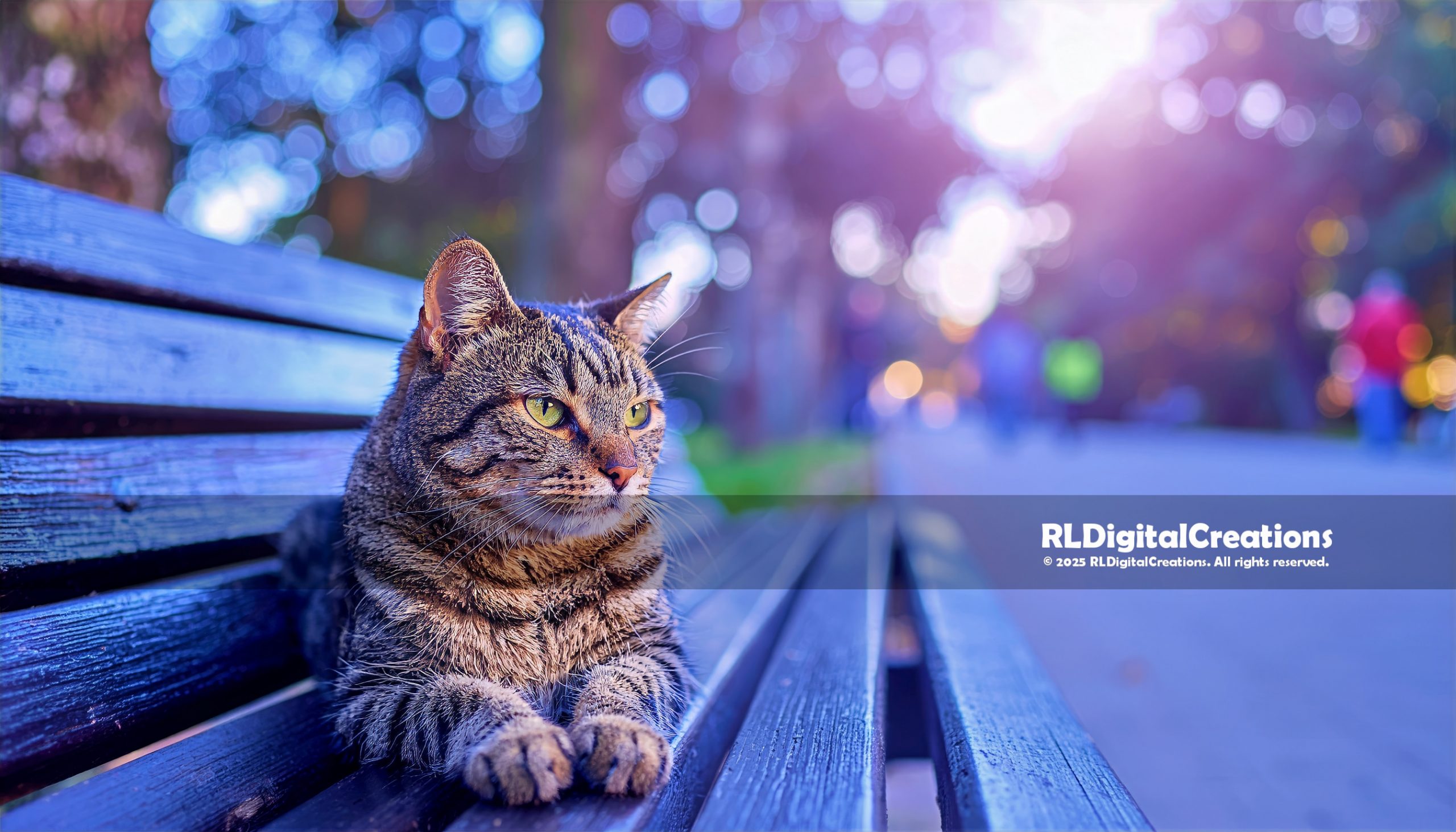 This vibrant digital artwork captures a classic brown tabby cat perched confidently on a wooden park bench, its golden-green eyes glowing against a dreamy blur of neon purples, blues, and soft city light. The shallow depth of field turns passing pedestrians and trees into shimmering bokeh, creating a magical contrast between urban motion and the cat’s calm, regal stillness. This high-resolution digital download is available for $10, offering you an eye-catching statement piece that brings cinematic city vibes and feline elegance to any room.