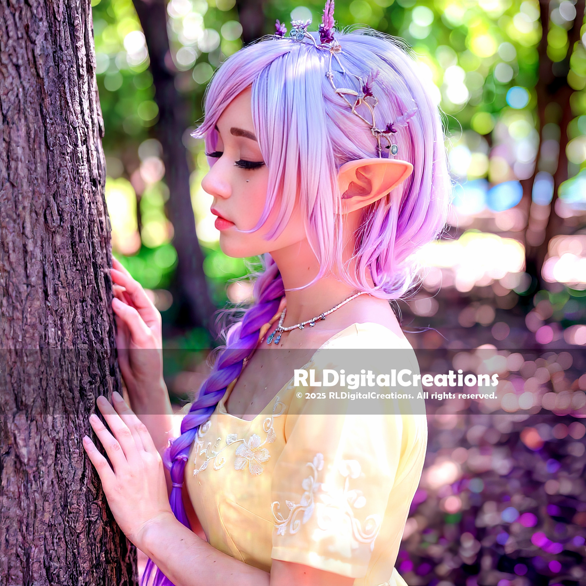 Bathed in soft woodland light, a lavender-haired elf maiden rests her hands against an ancient tree, eyes gently closed as if listening to the quiet heartbeat of the forest. Every detail—from the intricate floral crown and delicate braid to the warm glow on her pastel gown—captures a moment of pure serenity and enchantment, inviting the viewer into a world where nature and magic breathe as one. Perfect as a statement piece for fantasy lovers, this artwork brings a calming, ethereal presence to any room or digital space. This high-resolution digital download is available for $40.